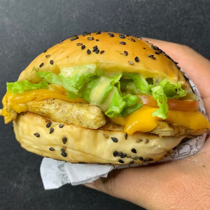 Pão com gergelim, filé de frango 100g, ovo, queijo cheddar, molho mac, tomate e alface.