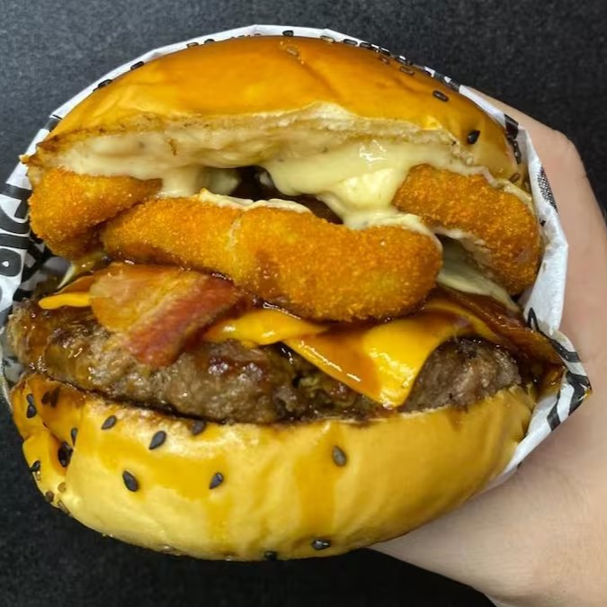 Pão com gergelim, blend 150g, bacon, queijo cheddar, 3x anéis de cebola, molho barbecue e molho mac.