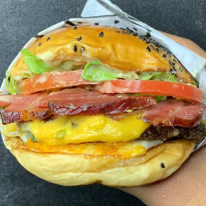 Pão com gergelim, blend 100g, ovo, queijo cheddar, molho mac, tomate e alface.