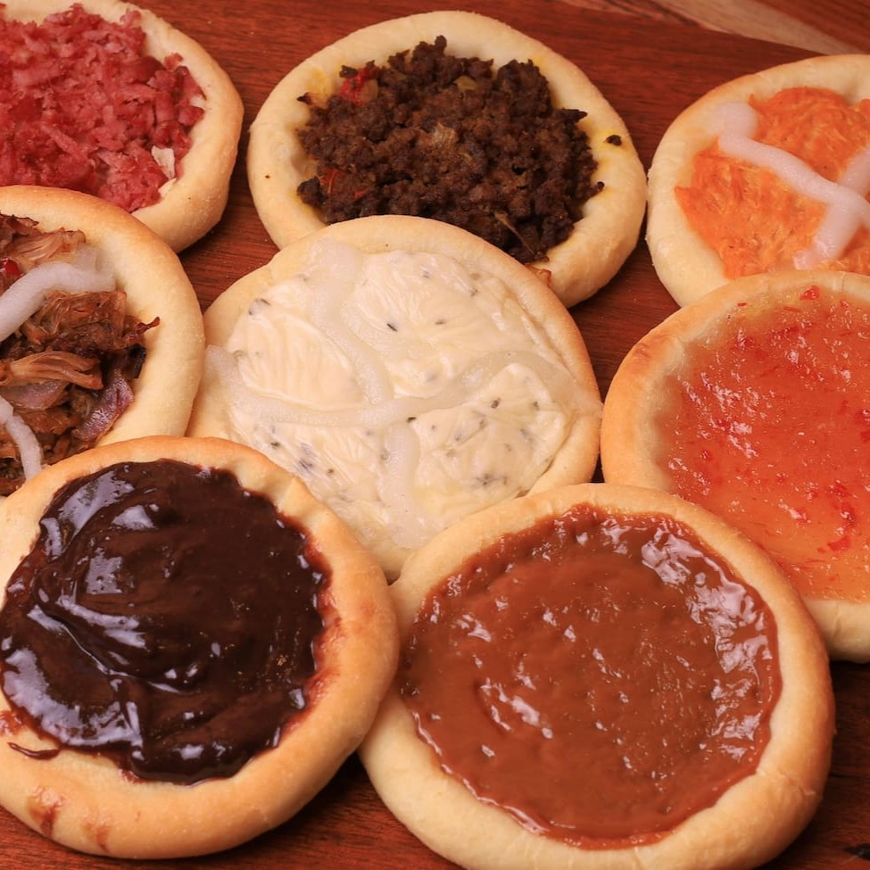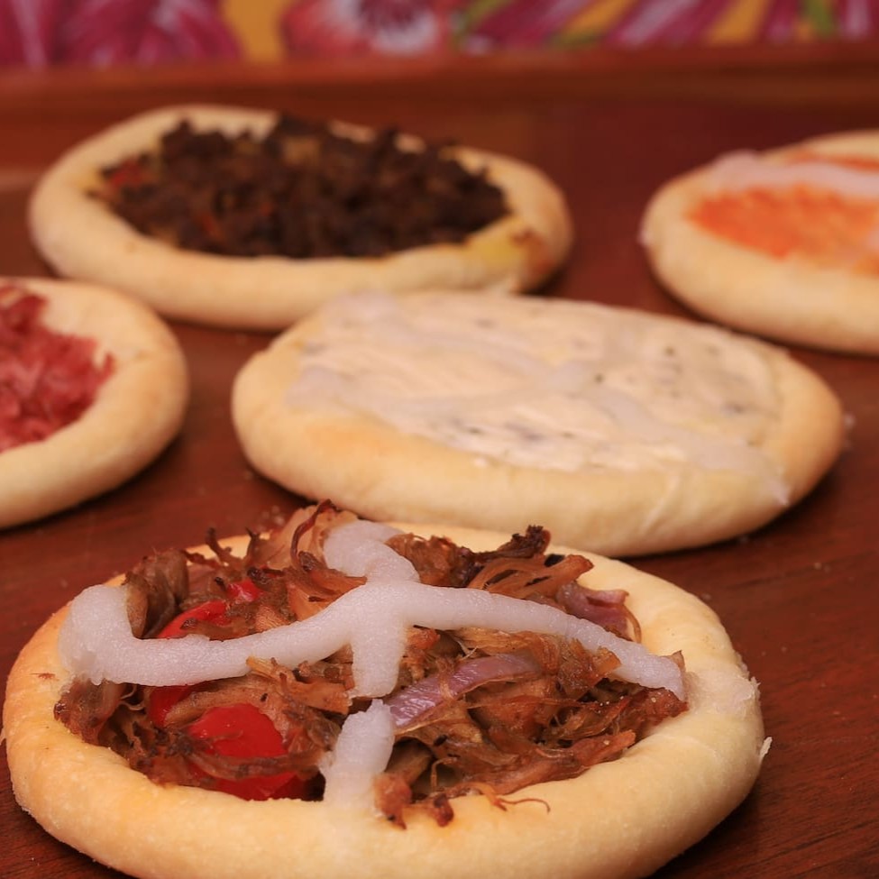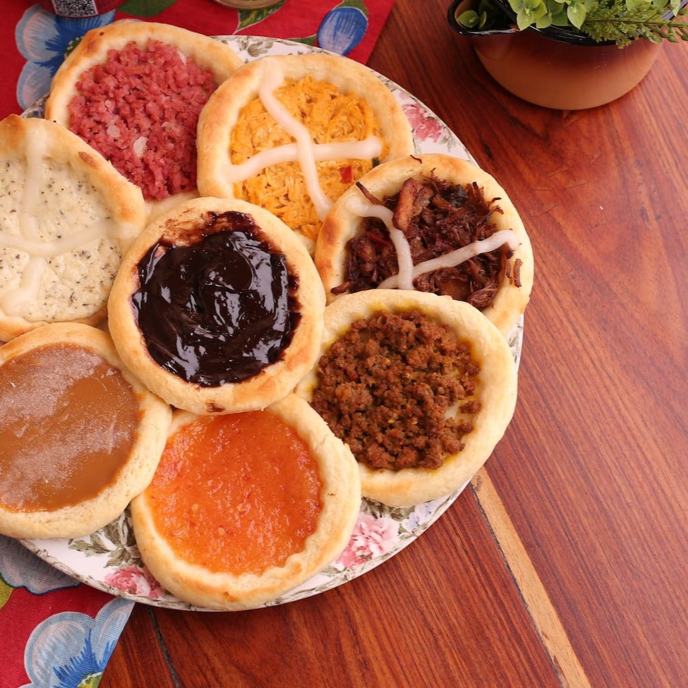 Deliciosas esfihas de sabores abertas recheadas, acompanham chutney de abacaxi picante. Sabores (frango com Catupiry, 3 queijos, calabresa e queijo, carne, chocolate e churros).