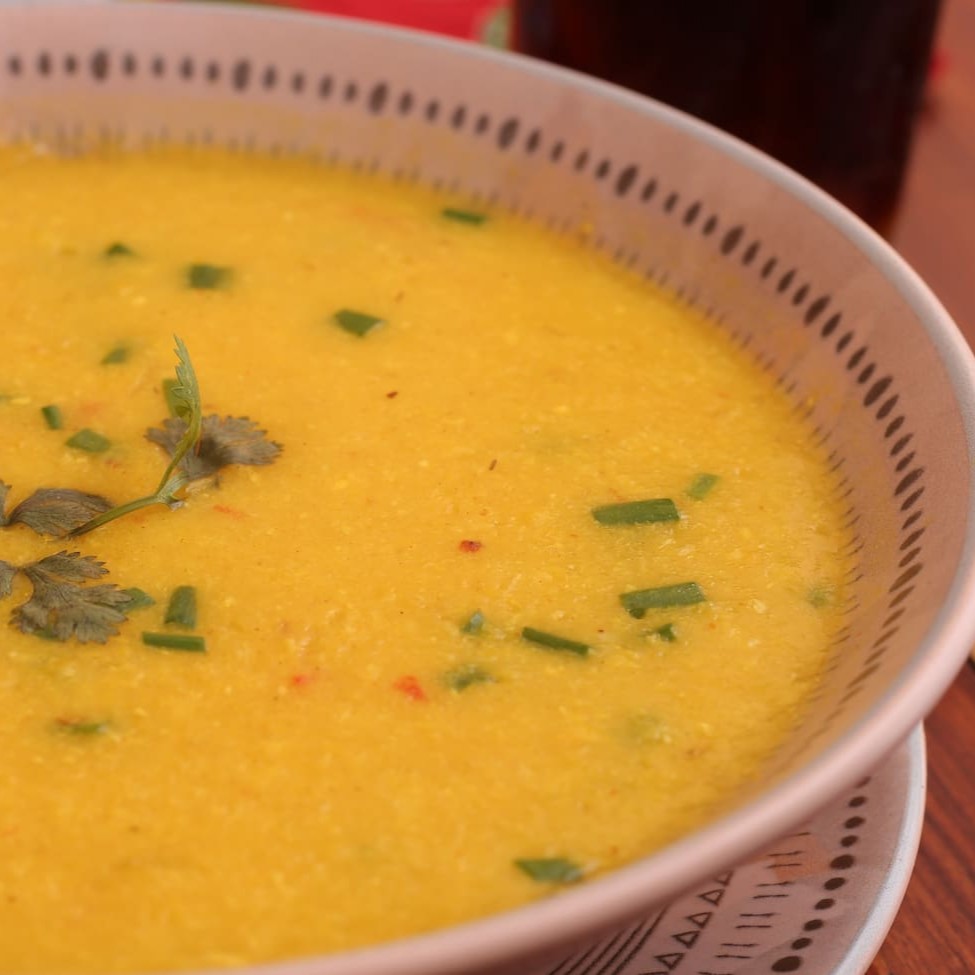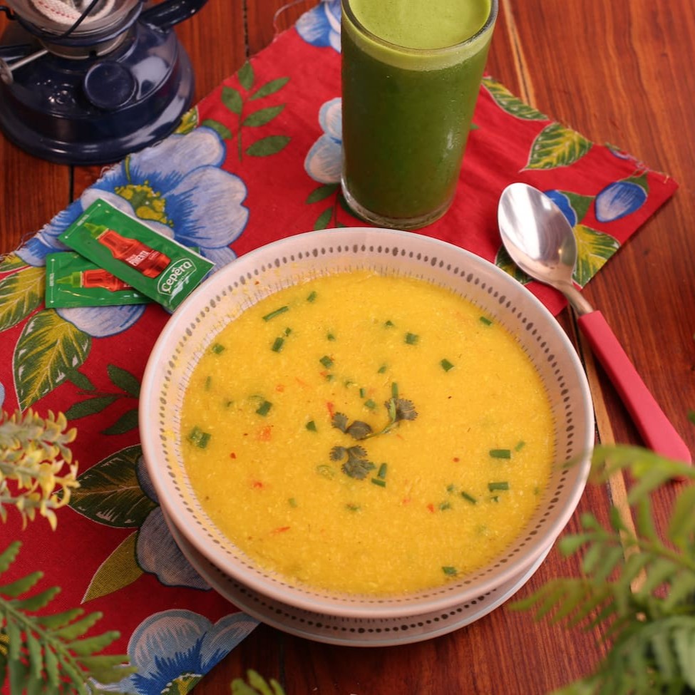 Creme de milho ralado, muito tempero, refogado de palmito, pimenta calabresa, cebolinha e queijo (Apimentado).