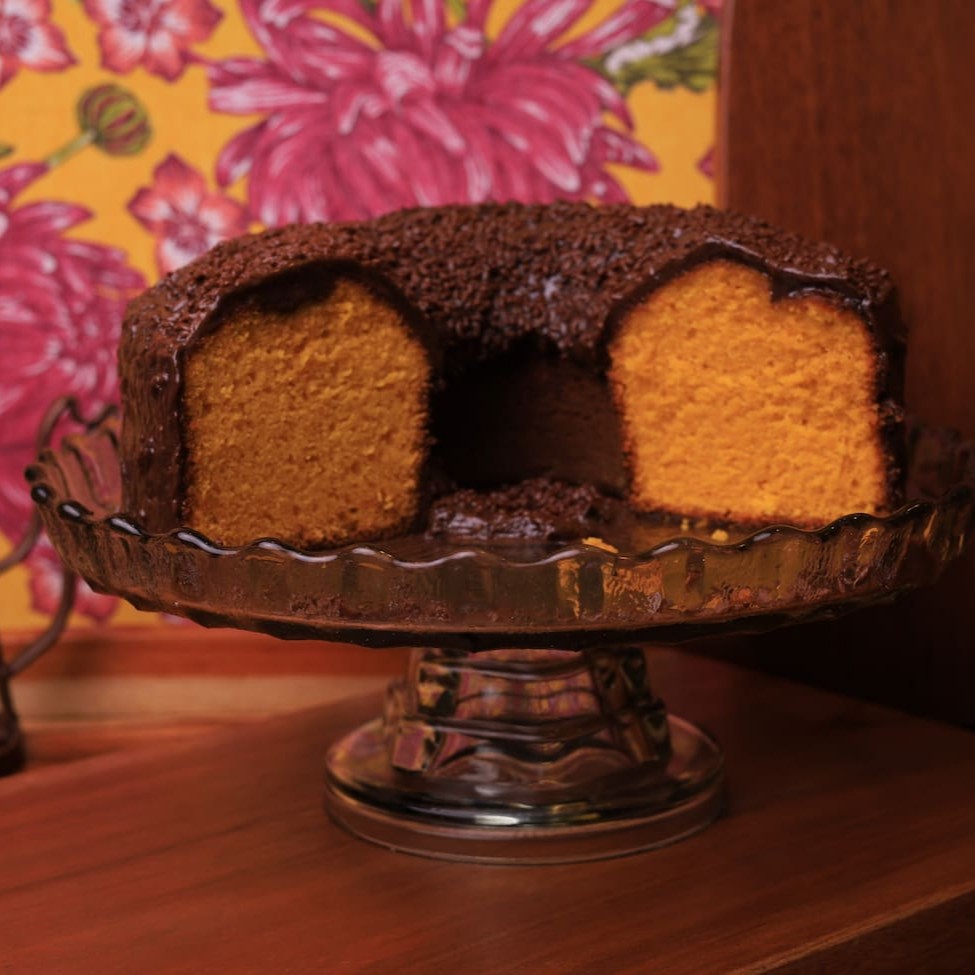 Deliciosa fatia de bolo de cenoura com cobertura de brigadeiro de chocolate