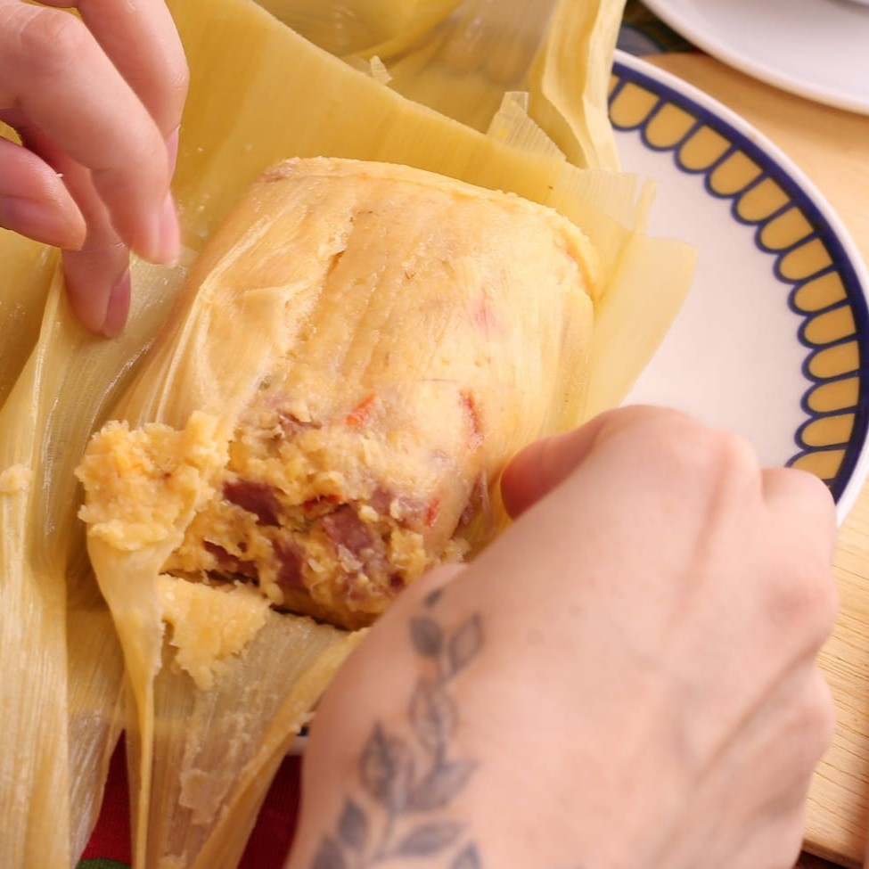 Pamonha 100% milho, pimenta, temperos e linguiça suína. (Sem glúten/sem lactose).