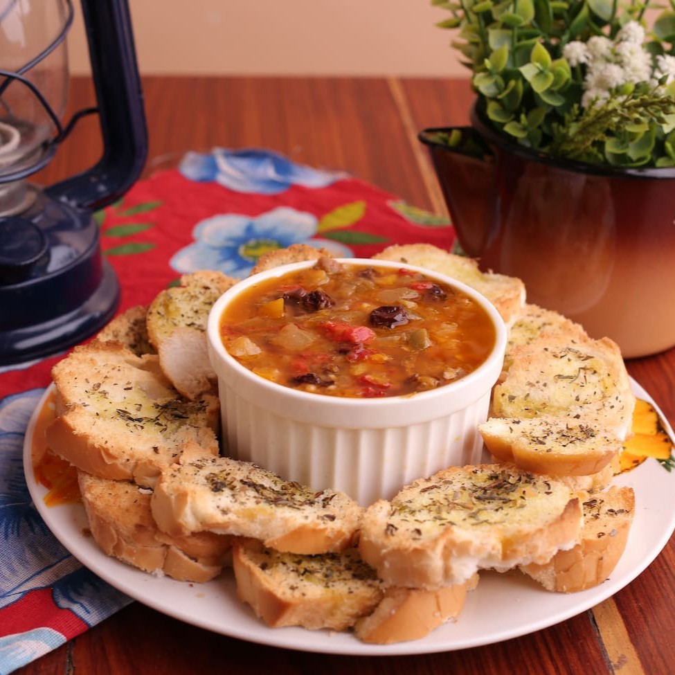 Antepasto de berinjela, pimentões, passas, azeitonas e azeite de oliva. Acompanha torradas artesanais. Ideal para acompanhar um bom vinho.