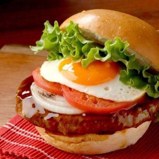 Pão, carne, ovo, mussarela, salada, batata palha, barbecue e molhos tradicionais