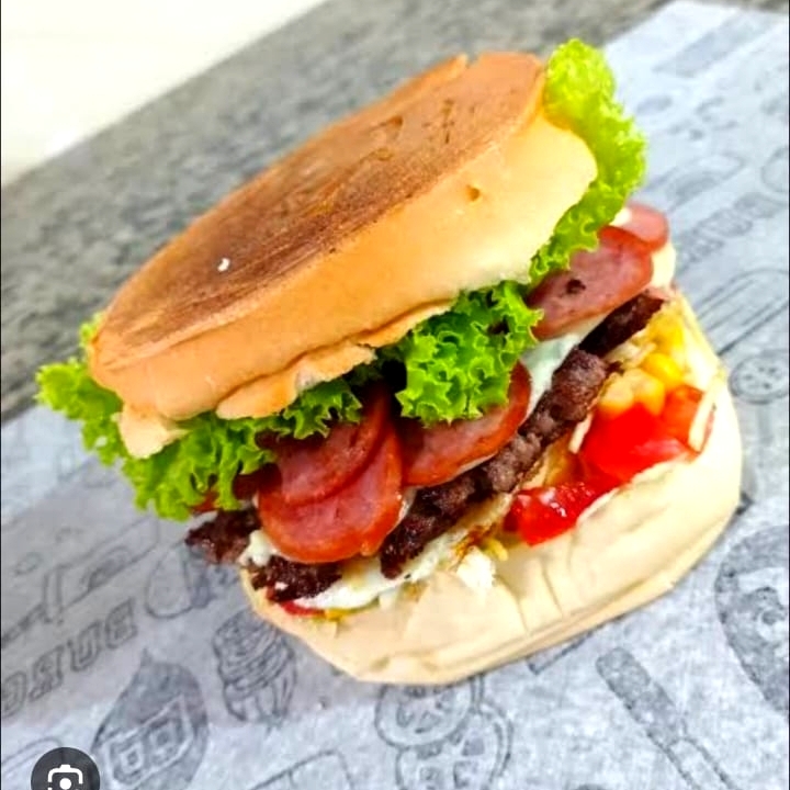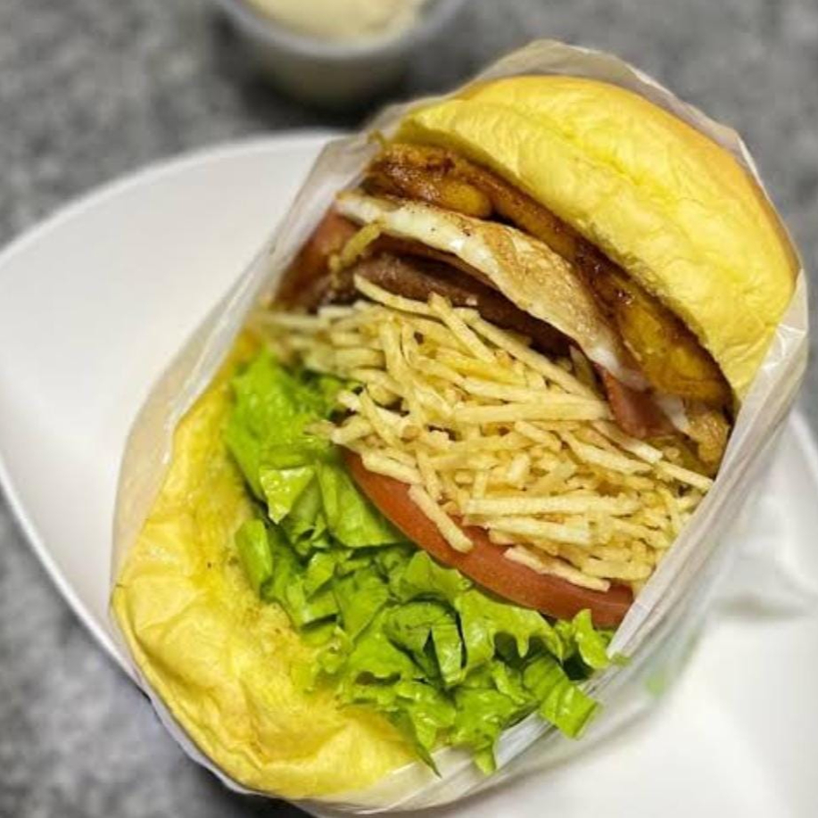 Pão, carne, queijo, presunto, calabresa, ovo, bacon,mix e salada tomate, pepino, alface e batata palha.