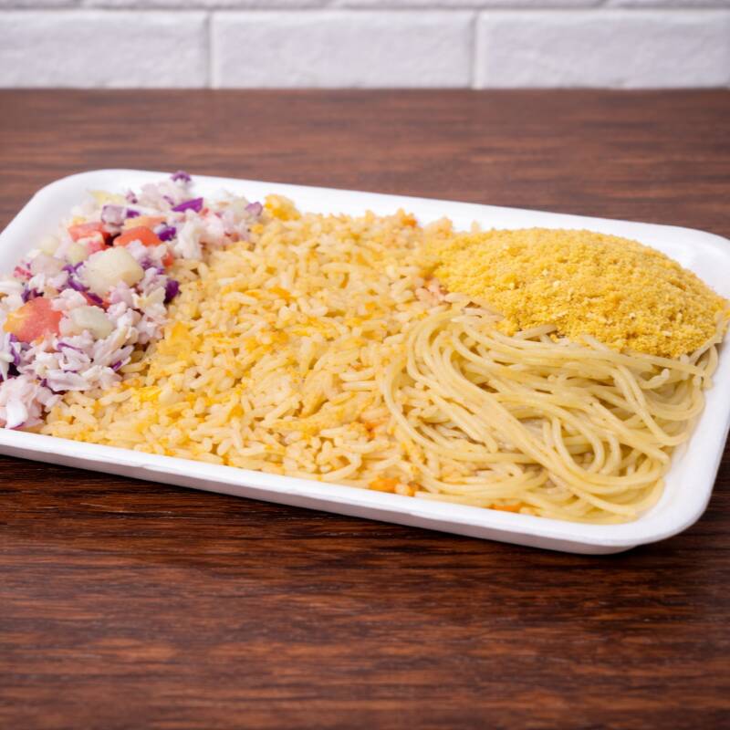 Arroz, macarrão, salada e farofa
