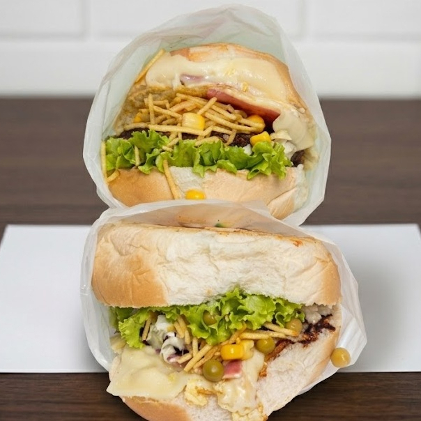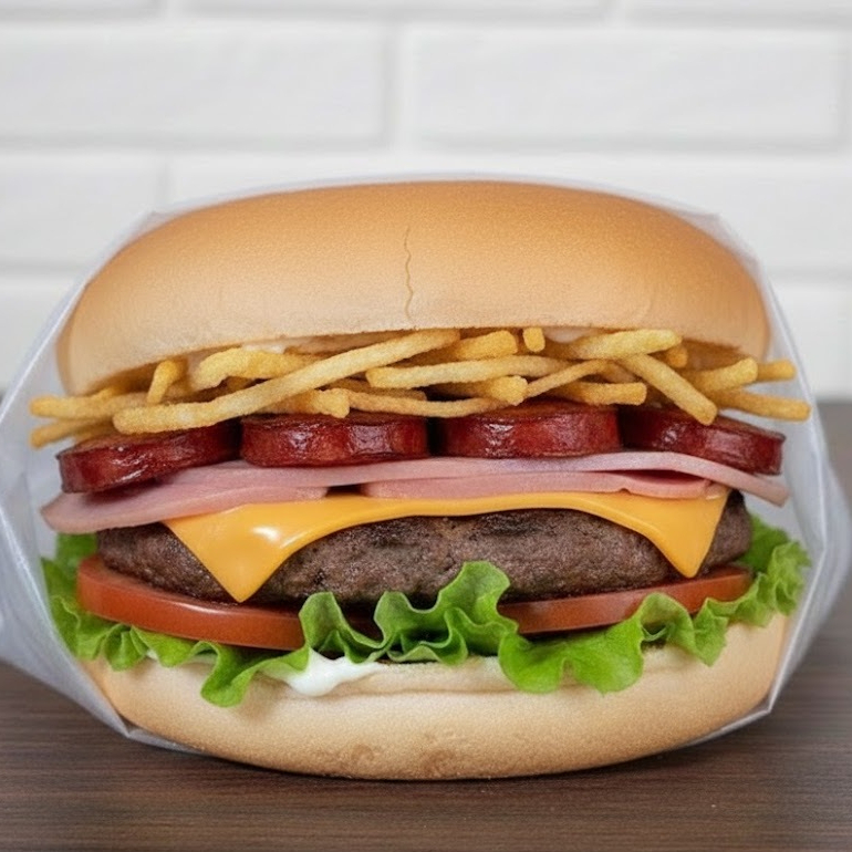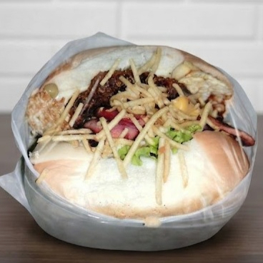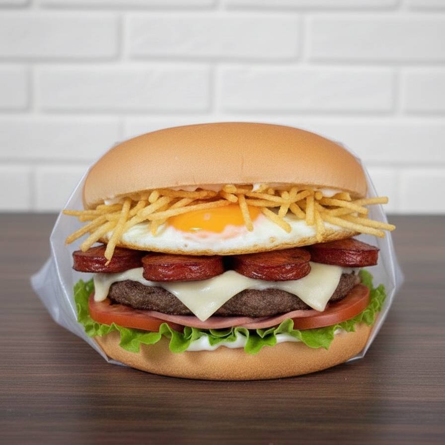 Pão, 02 carnes, 02 ovos, calabresa, queijo, presunto, salada e batata palha