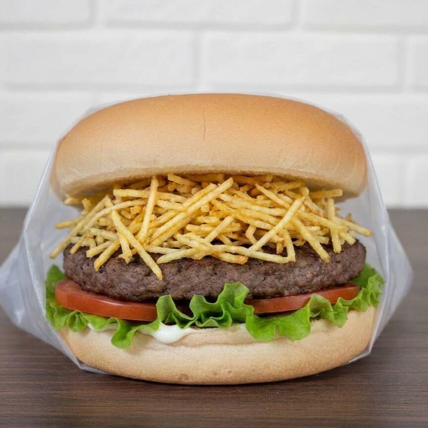 Pão, carne, queijo, presunto, salada e batata palha