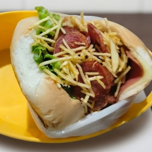 Pão, carne, queijo, presunto, calabresa, salada e batata palha
