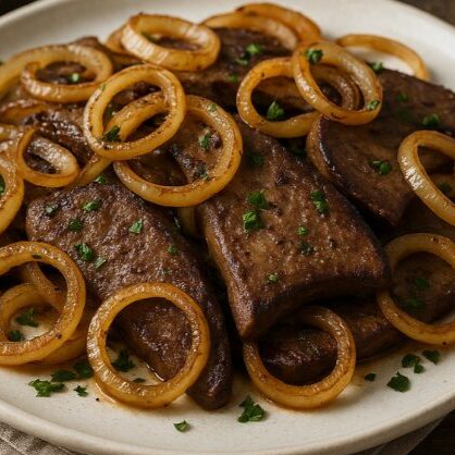 Bife de figado acebolado, acompanhado de feijão, arroz, macarrão, salada e farofa.
