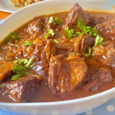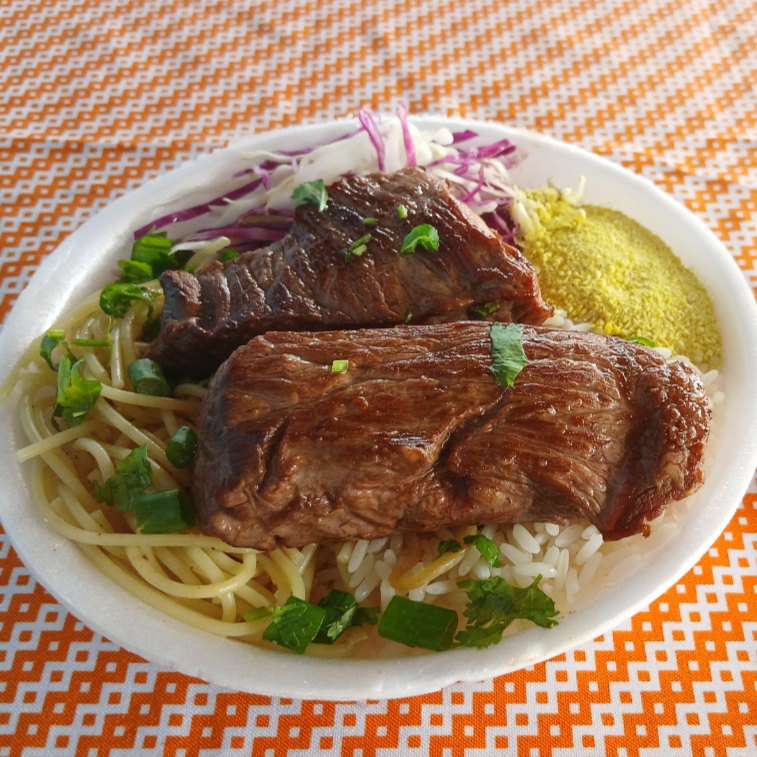 Carne bovina guisada ao molho, acompanhada de feijão, arroz, macarrão, salada e farofa.