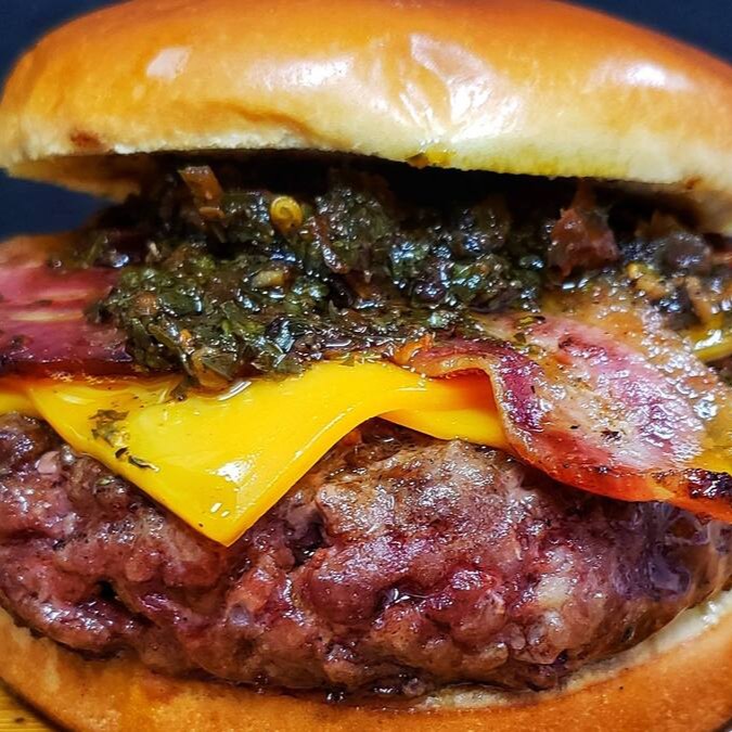 Blend de peito e acém 220g preparado na brasa, temperado com sal de parrilla, pimenta do reino e muito amor, queijo tipo cheddar, panceta e muito chimichurri (composto de pimenta, salsa desidratada, alho seco, páprica, entre outros ingredientes termogênicos). Servidos em um pão tipo brioche.