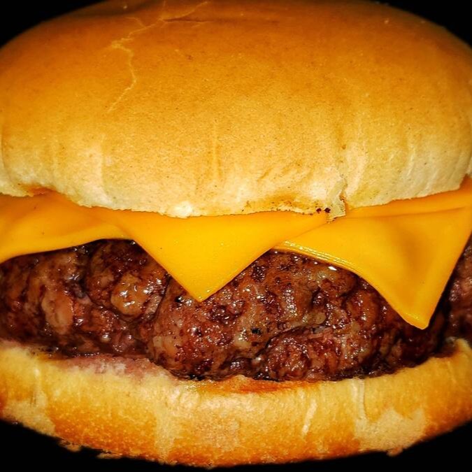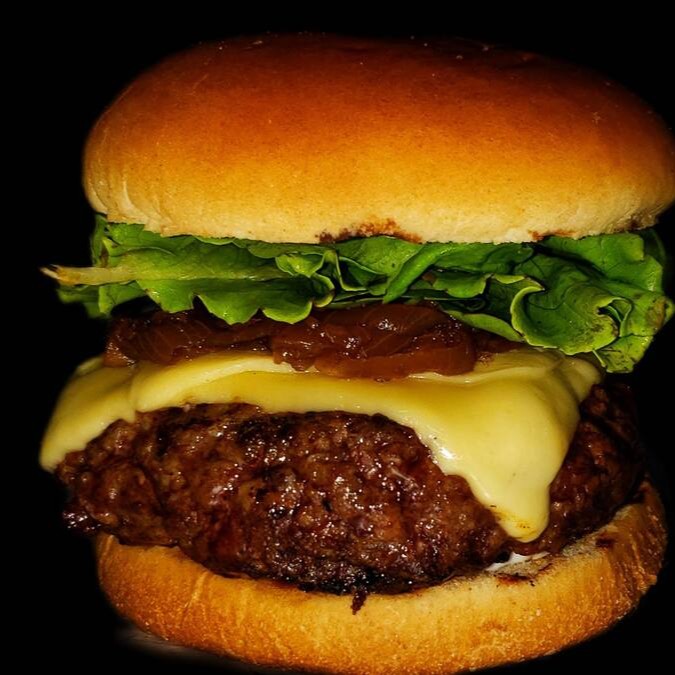 1 blend de 100g amassado na chapa até ficar fininho, alface americana, cebola caramelizada, maionese caseira e queijo cheddar.