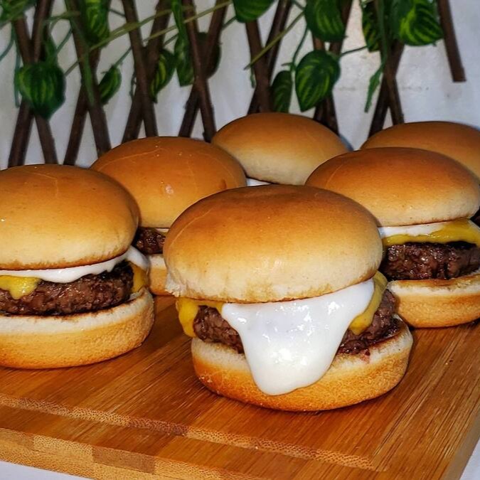06 unidades de mini x-burgers de 60g cada, acompanhados de uma porção de batata frita.