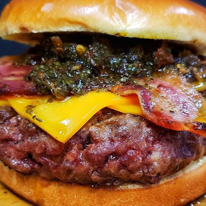 Blend de peito e acém 220g preparado na brasa, temperado com sal de parrilla, pimenta do reino e muito amor, queijo tipo cheddar, panceta e muito chimichurri (composto de pimenta, salsa desidratada, alho seco, páprica, entre outros ingredientes termogênicos). Servidos em um pão tipo brioche.