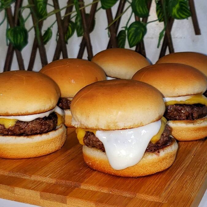 06 unidades de mini x-burgers de 60g cada, acompanhados de uma porção de batata frita de 200g.