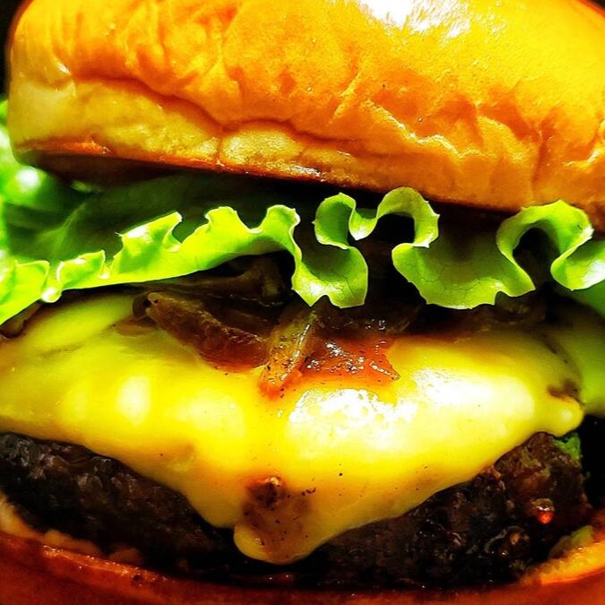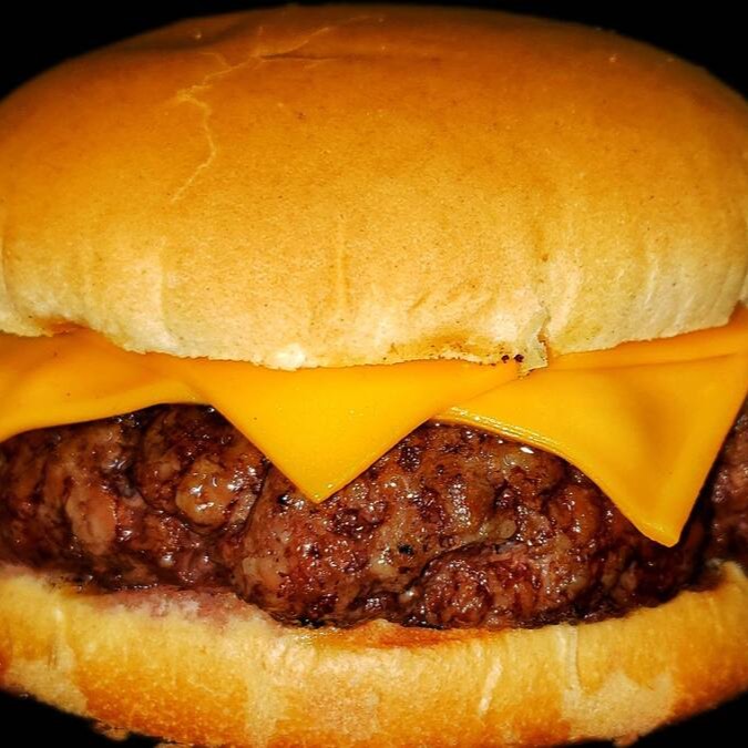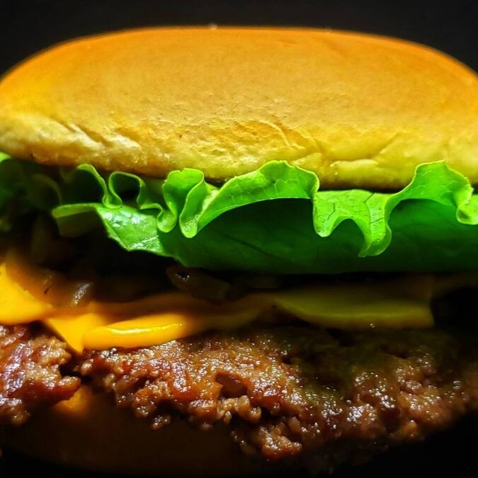 1 blend de 100g amassado na chapa até ficar fininho, alface americana, cebola caramelizada, maionese caseira e queijo cheddar.