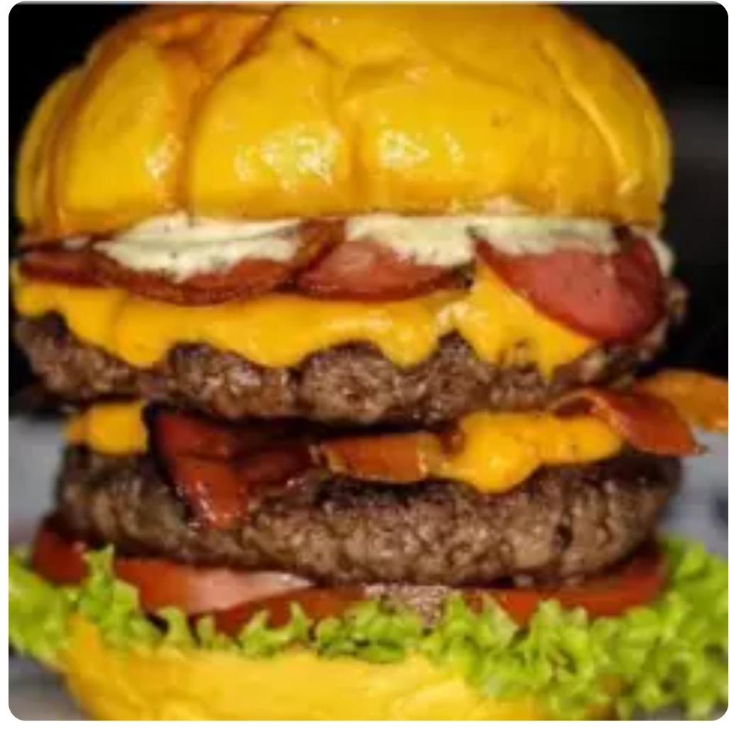 2 carne 180 pão brioche, bacon, calabresa queijo cheddar, molho cheddar, cebola caramelizada, e salada.