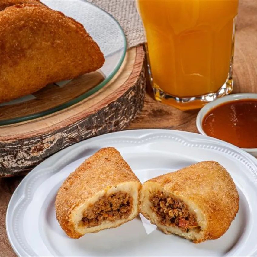 Risoles recheado com carne moída bem temperada e cebolas, frito até ficar dourado.