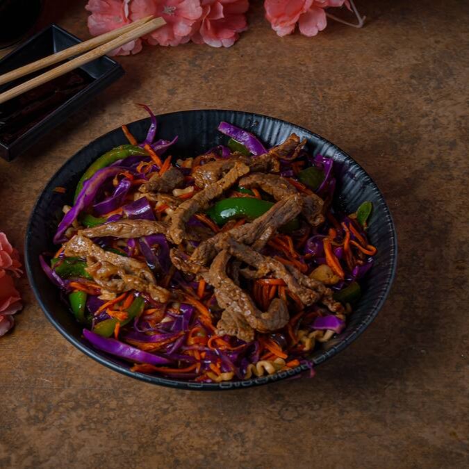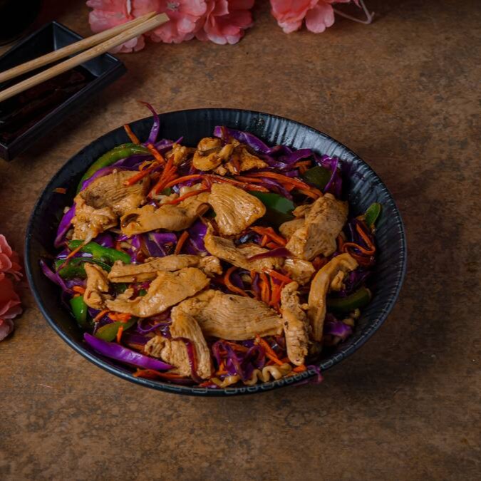 Macarrão, Pimentão, cenoura, repolho, cebola, Carne e frango