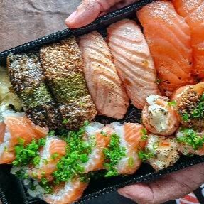 4 Joe salmão, 5 sashimi salmão, 5 uramaki salmão filadélfia, 5 hossomaki salmão, 6 niguiri salmão