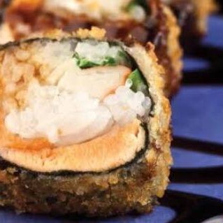 Camarão maçaricado no molho tonkatsu, cream cheese, pepino envolto por uma fatia de salmão empanado com gergelim e molho tarê.