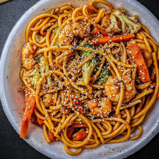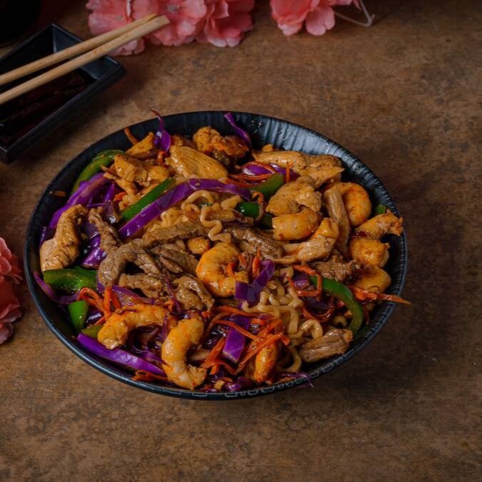 Macarrão,Pimentão, cenoura, repolho, cebola , frango, carne e camarão