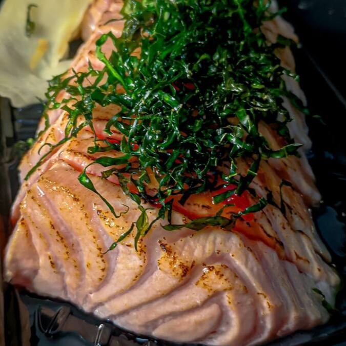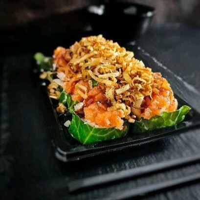 Sashimi de salmão levemente maçaricado, pimenta sweet chilli, tarê e couve crispy.