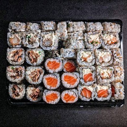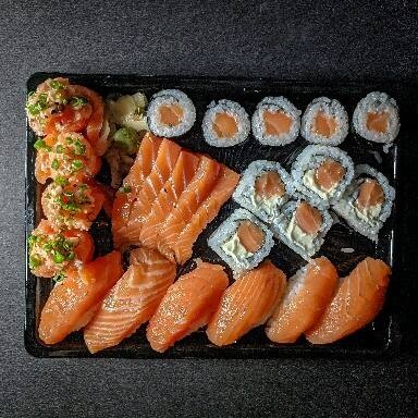 2 joe salmão, 2 sashimi salmão, 5 uramaki salmão filadélfia, 5 uramaki camarão.