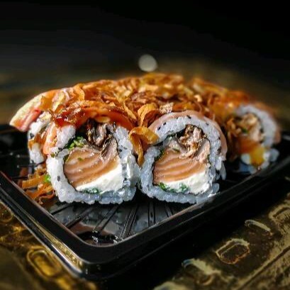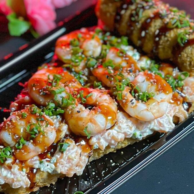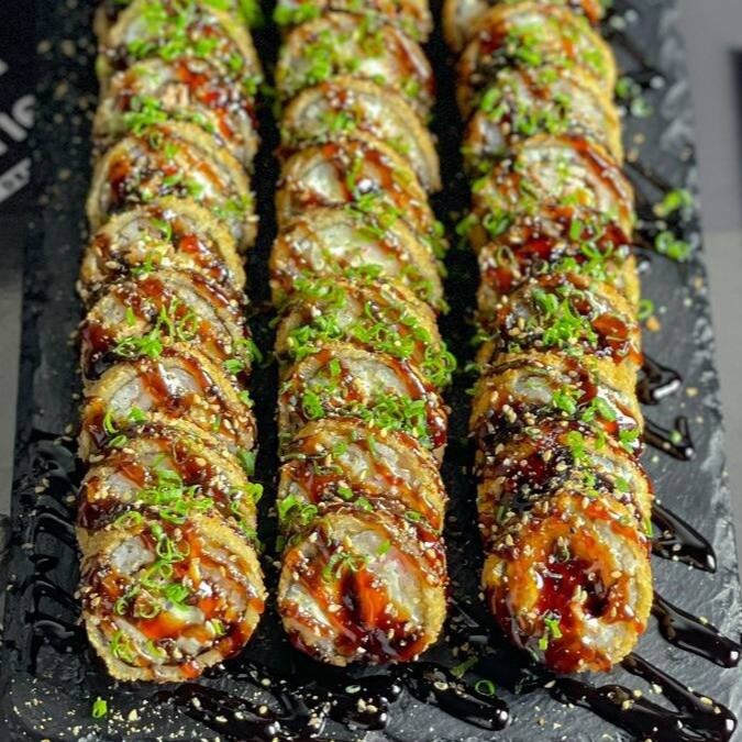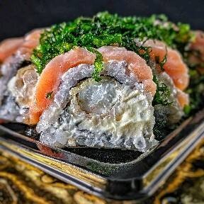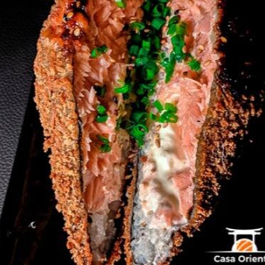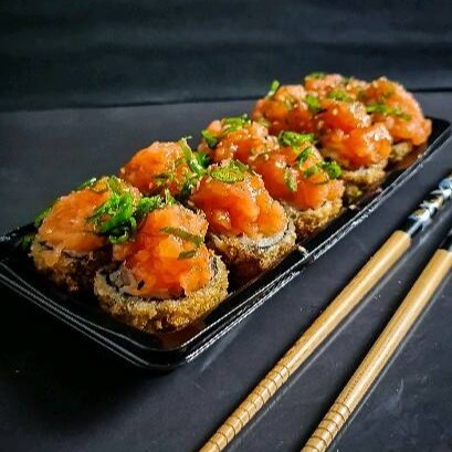 Camarão empanado, salmão, cebolinha, coberto por uma camada de cream cheese maçaricado e pimenta sweet chilli.