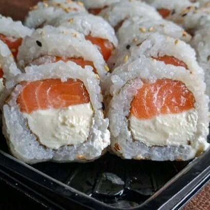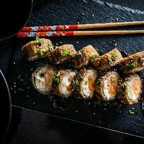 Salmão, cream cheasse, arroz, massa de harumaki.