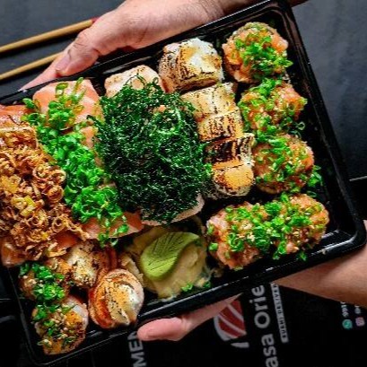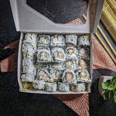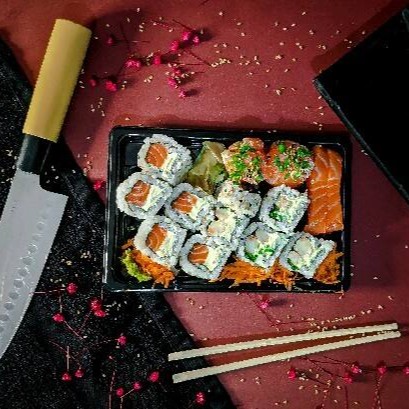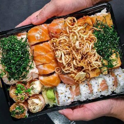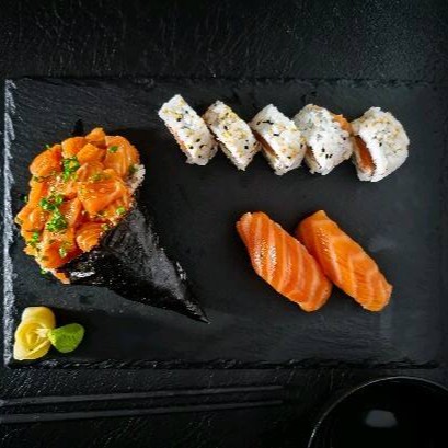 02 unid. Niguiri salmão, 02 unid. Niguiri salmão maçaricado, 02 unid. Niguiri skin, 02 unid. Joe salmão, 02 unid. Joe fusão, 02 unid. Joe camarão flambado, 05 unid. Uramaki filadélfia especial.