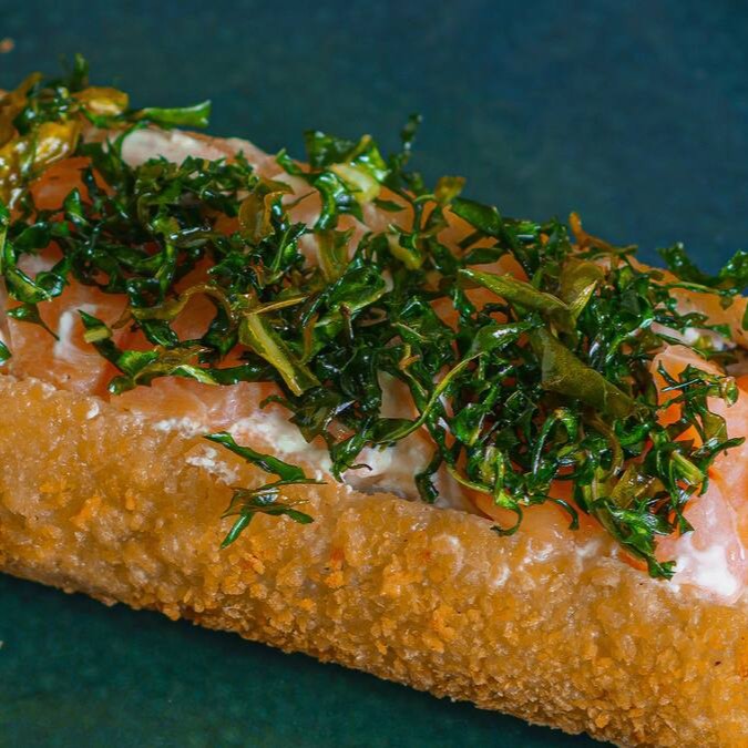 Cream cheese, camarão empanado envolto com fatia de salmão levemente maçaricado, pimenta sweet chilli e couve crispy