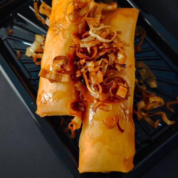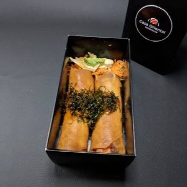 Massa harumaki, salmão, camarão, cream cheese, metade finalizado com tarê e alho poró crispy e outra metade finalizada com sweet chilli e couve crispy
