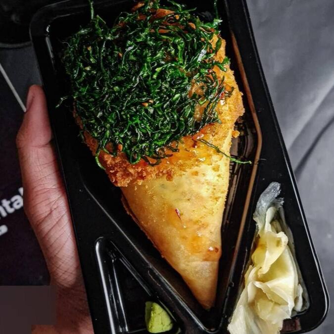 Arroz empanado em formato triangular, recheado com camarão cozido, pasta de se salmão, cream cheasse, cebolinha e tarê, com borda recheada com hot roll cream cheasse.