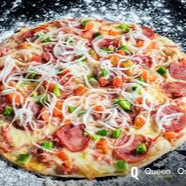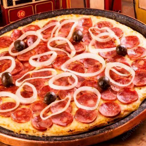 Molho, Queijo Mussarela, Calabresa, Presunto, Tomate, Cebola picada e Orégano.