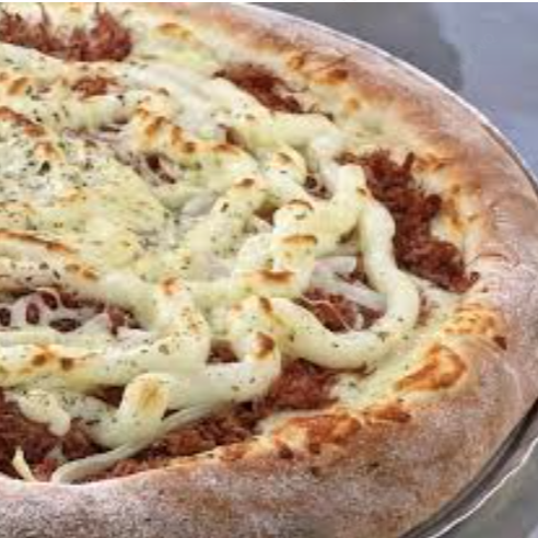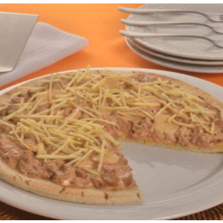 Molho, Queijo Mussarela, Frango desfiado, Catupiry, Tomate, Cebola picada e Orégano.