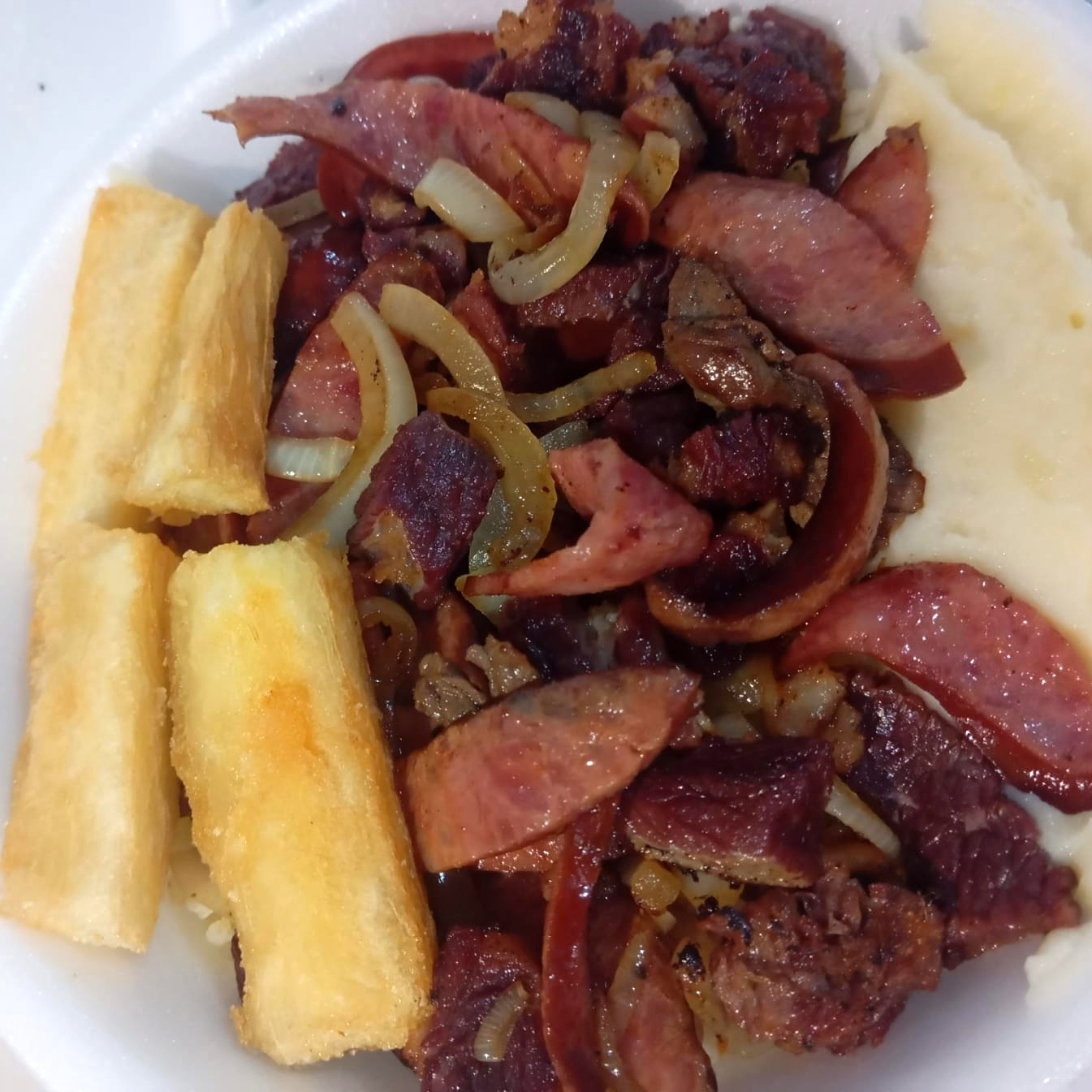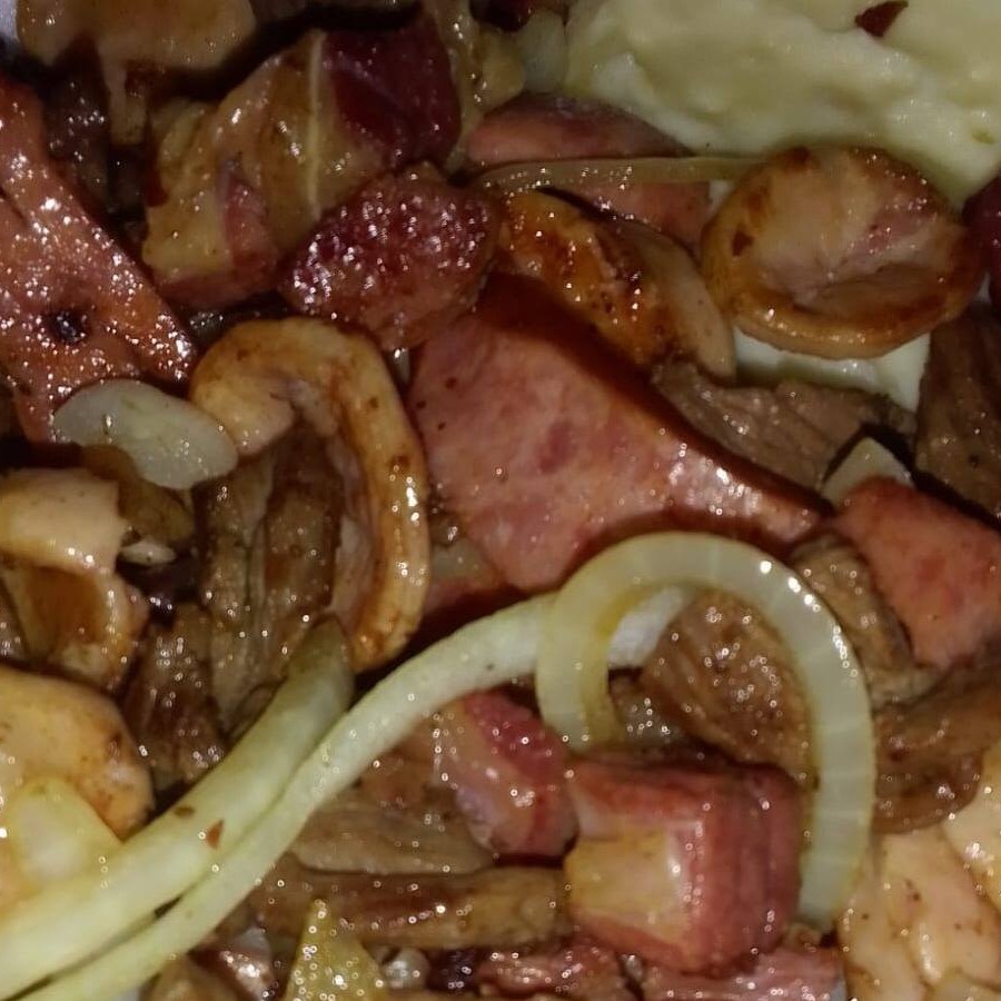 1 MISTÃO EM TIRAS(carne, frango, calabresa e toscana ). Acompanhado de arroz, purê de batata farofa e fritas.
