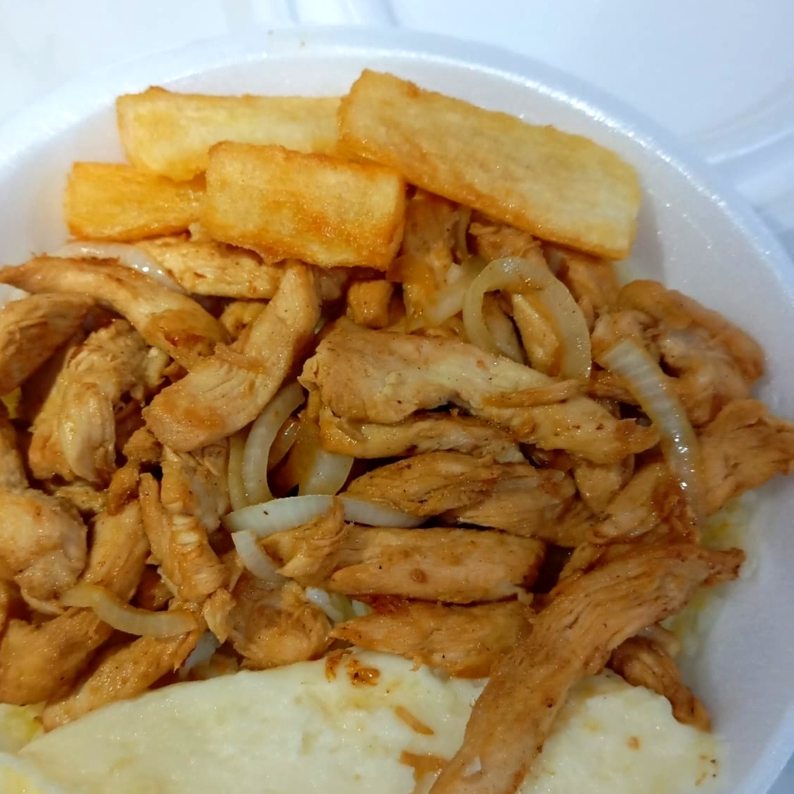 FILÉ DO PEITO DE FRANGO EM TIRAS , ACOMPANHADO DE MACAXEIRA OU BATATA FRITA,PURÊ DE BATATA E FAROFA RÊ DE BATAR, ACOMPANHADO DE MACAXEIRA OU BATATA FRITA , PURÊ DE BATATA ,