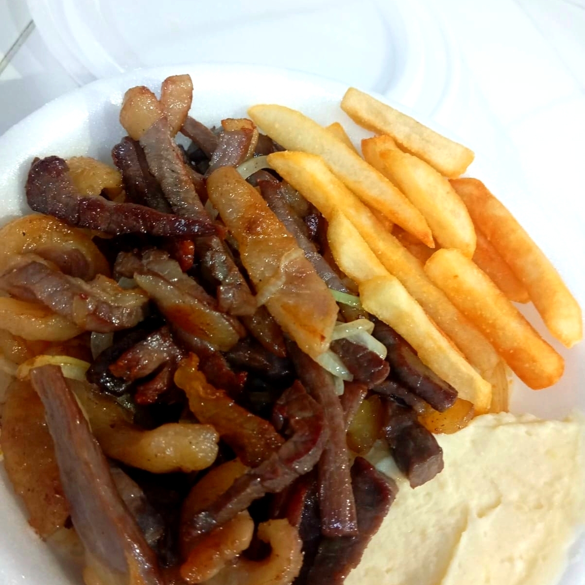 CARNE NA CHAPA EM TIRAS, ACOMPANHADO DE ARROZ PURÊ DE BATATA , FAROFA E FRITAS