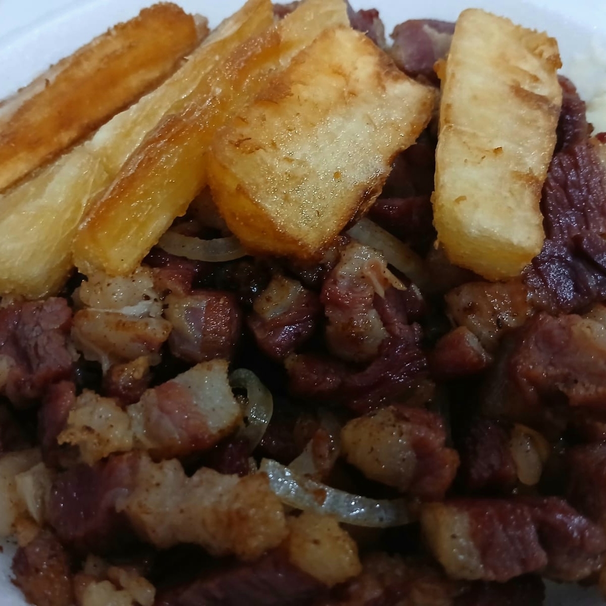 Charque Na Chapa Com Macaxeira Ou Batata Fritas.
