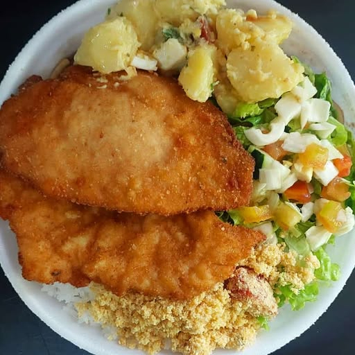 Filé de peixe frito empanado na farinha e super crocante. Acomp. feijão, arroz, macarrão, farofa, salada.
