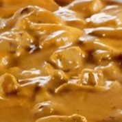 Delicioso strogonoff de filé, servido com arroz branco e batata palha.