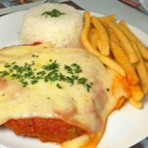 Filé empanado mergulhado no molho de tomate coberto com presunto e queijo derretido, servido com arroz branco e fritas