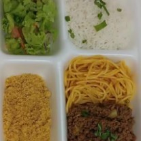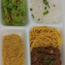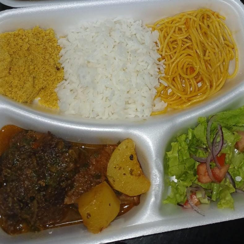 Picadinho de carne com legumes frescos, acompanhado de arroz branco, feijão, macarrão, farofa e salada. Uma refeição nutritiva.