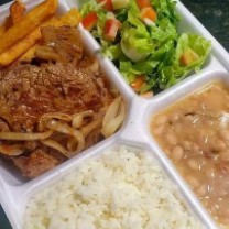 Delicioso bife de carne na chapa, servido com arroz branco, feijão, fritas, farofa e salada. Uma opção irresistível.