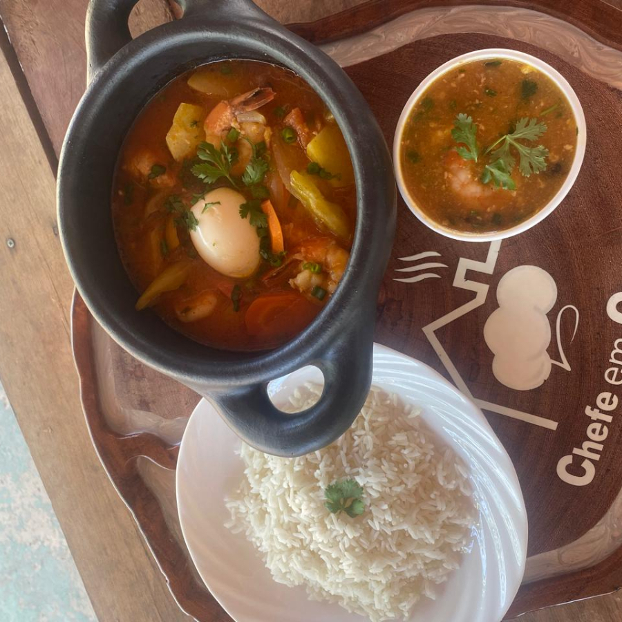 Caldeirada Mista da Chefe em casa Uma combinação irresistível de filé de peixe fresquinho e camarão rosa, cozidos em um molho cremoso com leite de coco, pimentões, tomate, cebola, e tempero da casa. Um prato cheio de sabor, carinho e aquele toque caseiro que só a Chefe em casa tem. perfeito para começar a semana com gostinho de mar e conforto.