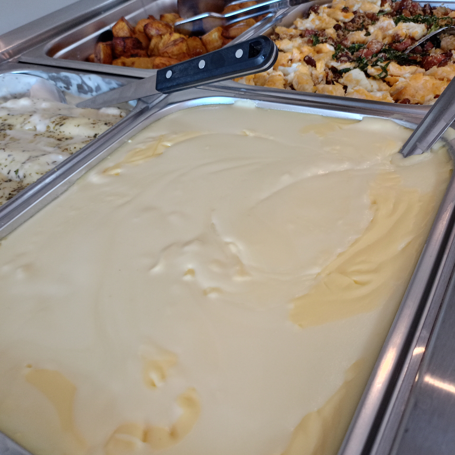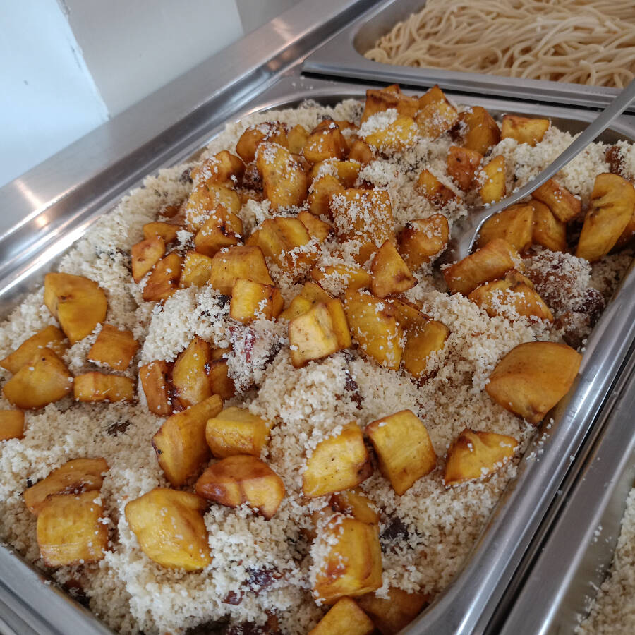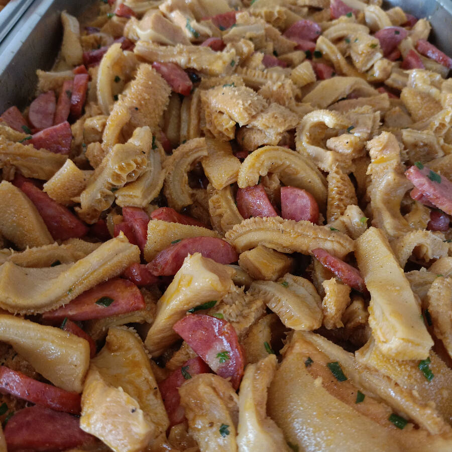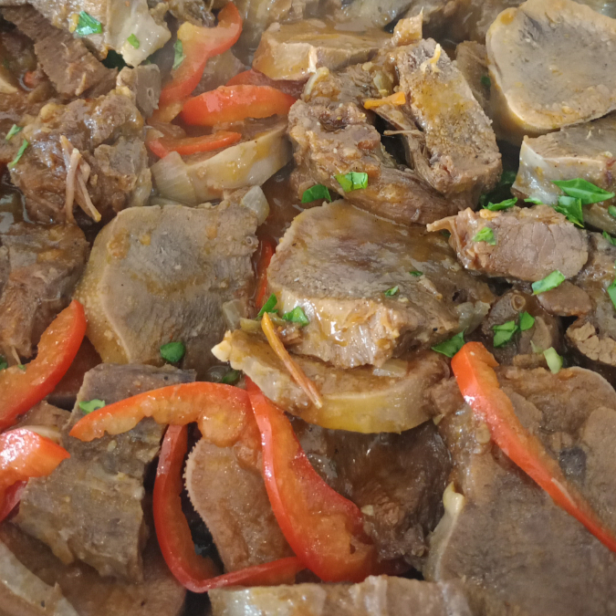 Língua Guisada, Arroz, Feijão, Macarrão, Farofa e Salada