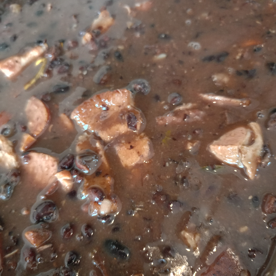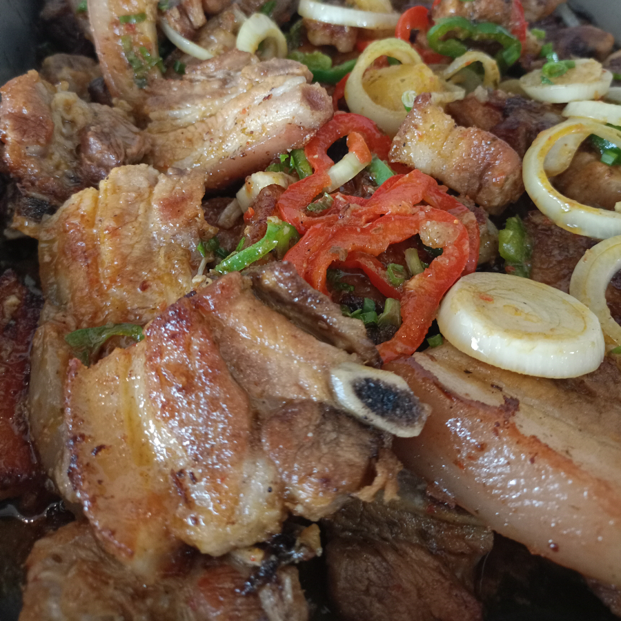 Porco guisado, Arroz, Feijão, Macarrão, Farofa e Salada